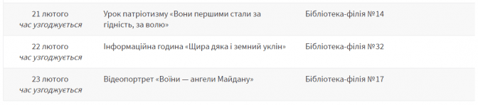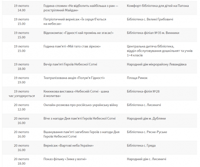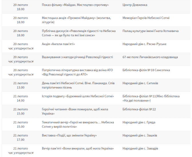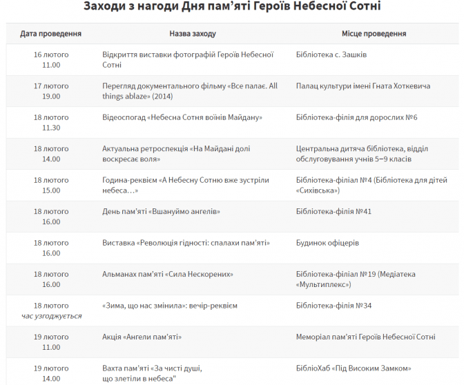 У Львові відбудеться низка заходів до Дня пам’яті Героїв Небесної Сотні. Зокрема, 19 лютого на Меморіалі пам’яті Героїв Небесної Сотні проведуть акцію «Ангели пам’яті». Під час акції на меморіал вішатимуть паперові ангели, які зробили львівські школярі.
