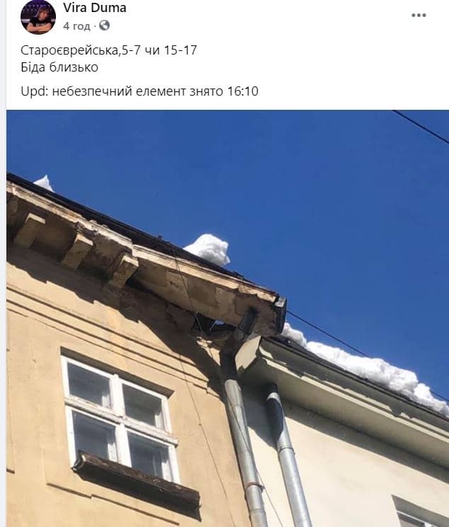 Також журналістка Галина Терещук опублікувала фото, на яких видно, що разом зі снігом, який важкими брилами падає з дахів львівських кам’яниць, з них злітають і частини фасаду.