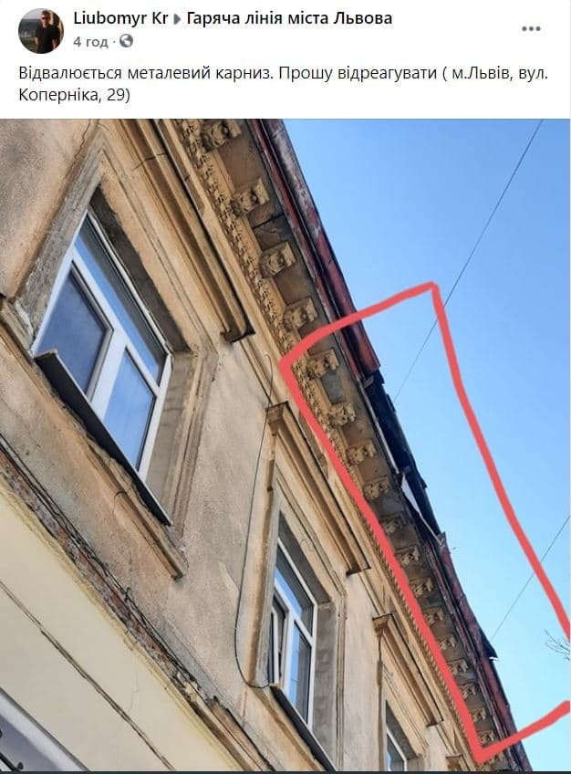 Також львів'яни звертаються і на Гарячу лінію міста, надсилають на Фейсбук сторінку повідомлення із фото аварійних фасадів.