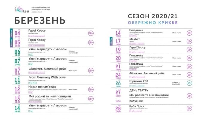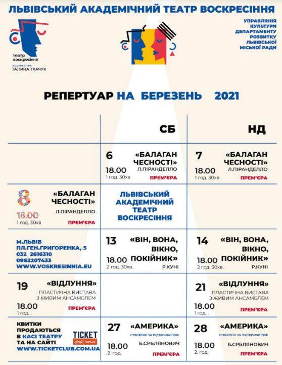Театр Лесі Українки пропонує глядачам у березні низку цікавих та різноманітних вистав. Також цього місяця заклад культури запрошує львів'ян відсвяткувати День театру 27-го березня.