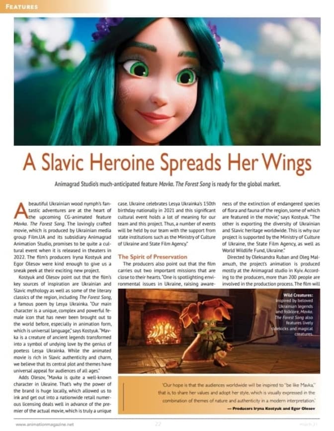 Образ Мавки із анімаційного фільму «Мавка. Лісова пісня» прикрасила обкладинку міжнародного видання «Animation Magazine», який що висвітлює індустрію анімації та освіту, а також візуальні ефекти. Про це на своїй сторінці у Фейсбук повідомляє Geek Journal.