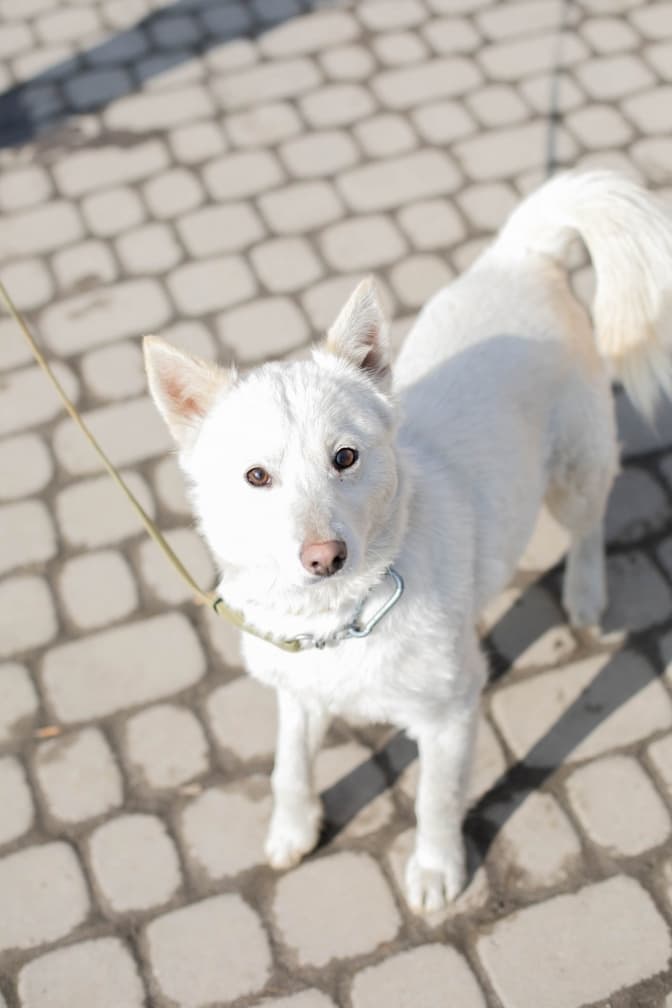 Наші ловці її ледь помітили посеред снігових кучугур. Біла, як сніг, але яскрава, як сонце. Радіє кожному, хто її погладить. Буде тішити вас своїм позитивом 365 днів на рік.