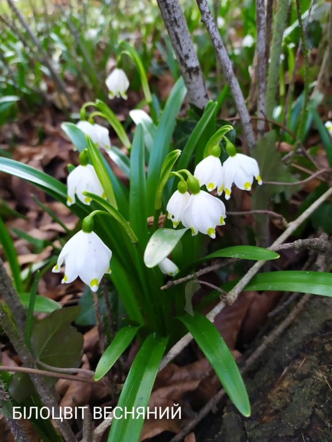 Білоцвіт весняний – вид, що трапляється на узліссях букових лісів у Центральній Європі, зокрема в Карпатах. Це багаторічна рослина заввишки до 20 см із яйцевидною цибулиною діаметром до 2 см. Листя у білоцвіту весняного широколанцетне, завдовжки до 25 і завширшки до 1,2 см, а квітконоси піднімаються на висоту до 30 см.