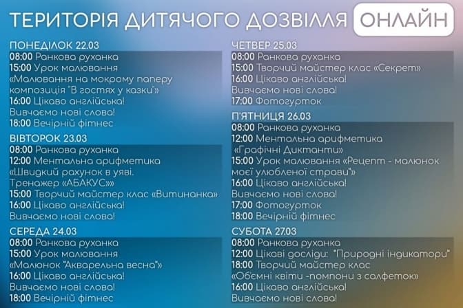Йдеться про ранкові та вечірні руханки, заняття з англійської, малювання та арифметики, різноманітні цікаві досліди, майстер-класи та конкурси.