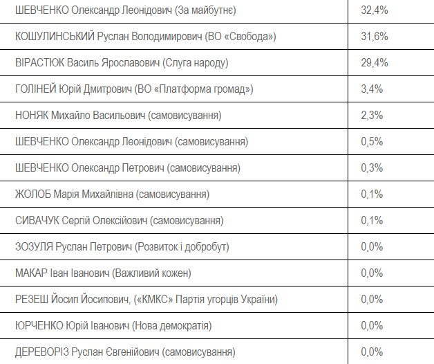 Станом на 18:00 Шевченко перемагає, набравши 32,4% голосів виборців. На другому місці – Руслан Кошулинський з 31,6%, на третьому – представник партії «Слуга народу» Василь Вірастюк. У нього 29,4% голосів.
