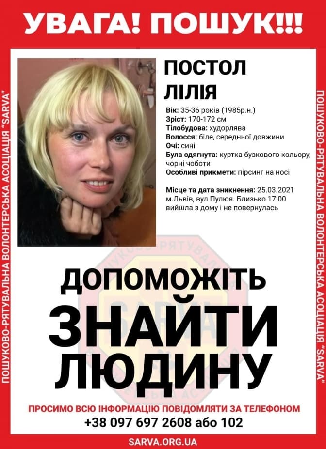 У Львові оголосили в розшук 35-річну львів’янку Лілію Постол. Про це Тvoemisto.tv розповіли у Пошуково-Рятувальній Волонтерській Асоціації, яка задіяна до пошуку.