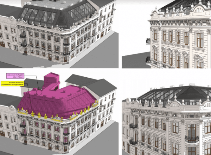 На візуалізації позначено, що деякі елементи фасаду втрачені чи пошкоджені, і що дах тут планують добудувати. Він матиме металевий профіль, пропускатиме свтіло і не буде перегріватися.