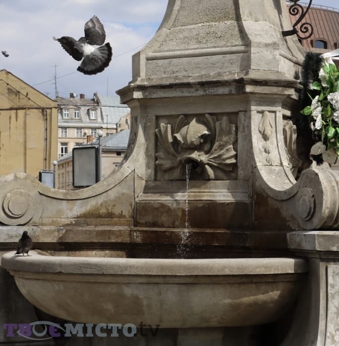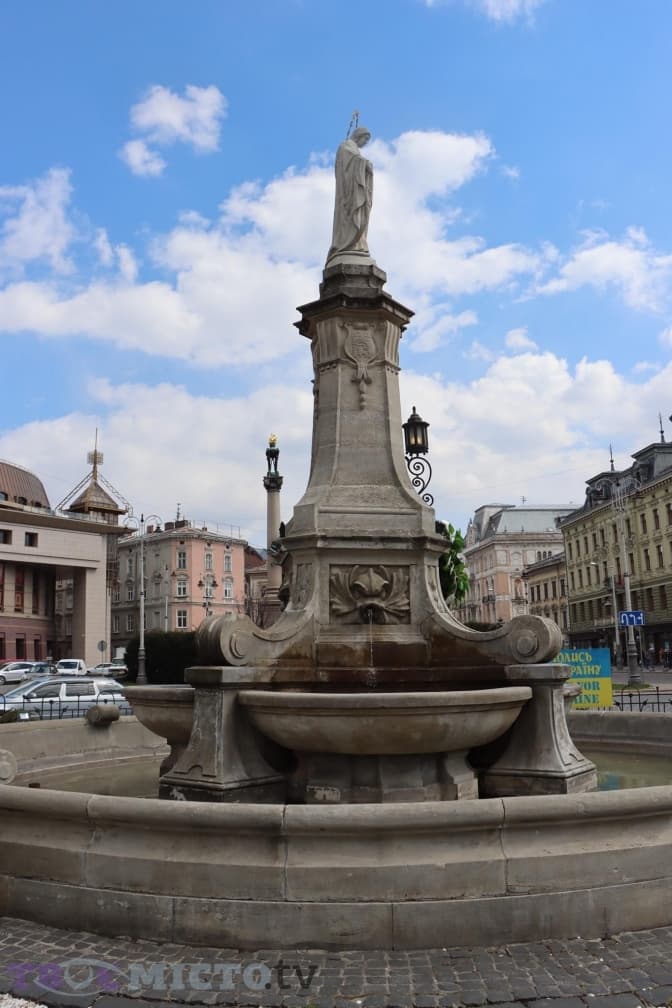 Поряд з цим фонтаном тихо та затишно. Лише міські птахи купаються у воді. Цей фонтан має дуже давню історію. Ще у 1841 році у центрі Львова з’явилося джерело, яке утворилося після знесення старих фортифікаційних мурів. Тож у 1846-47 роках на місці тимчасової криниці збудували з тесаного каменю нову, у центрі якої містилась велика ваза. Скульптуру Діви Марії помістили на цьому місці у 1904-му році.