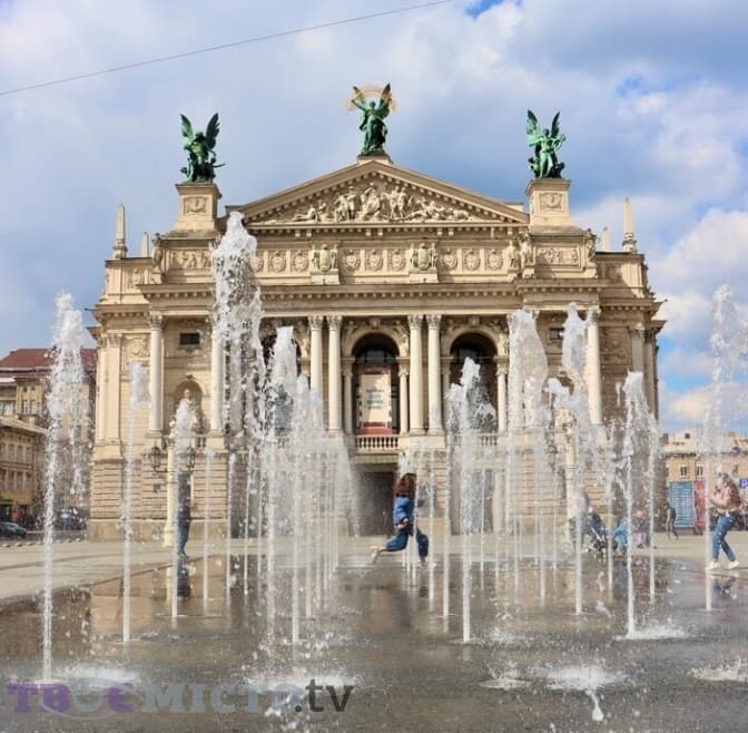 Біля фонтану навпроти Оперного театру найбільше людей. Вони знімають біля нього фото, відео, а діти бавляться, бігаючи поміж струменями. Цей фонтан зовсім новий, адже відкрився тут лише торік.