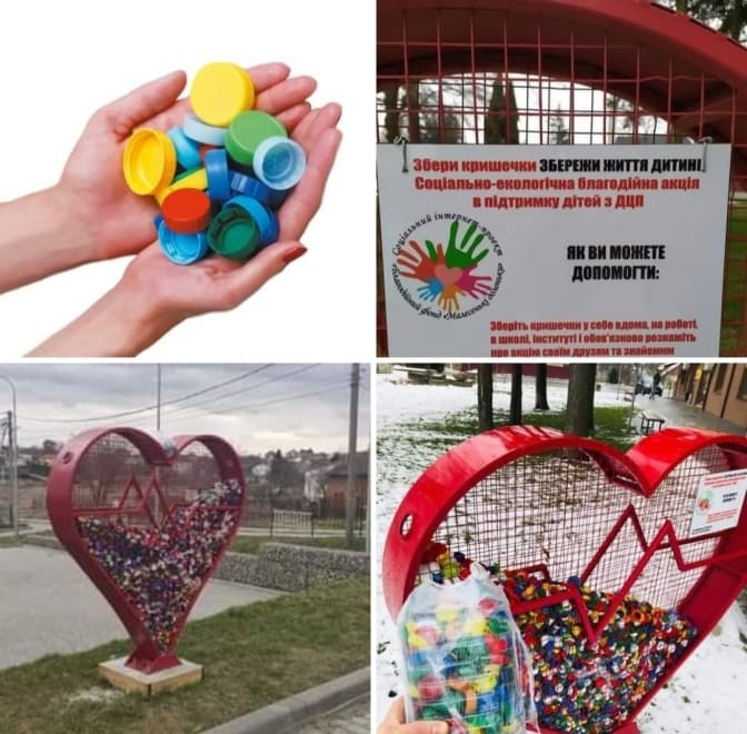 У громадських просторах неподалік Львова поставили інсталяції-контейнери у формі серця, куди можна кидати пластикові кришечки. Згодом їх здадуть на переробку, а виручені від цього кошти спрямують на допомогу важкохворим дітям. Таку ініціативу запустили у межах екологічно-соціального проєкту «Кришечки збери – Дитині допоможи» у співпраці з БФ «Малесенькі долоньки».