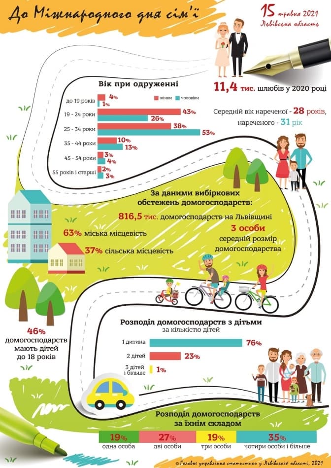 Минулого року на Львівщині зареєстрували 11,4 тис. шлюбів, що на 24,7% менше, ніж позаминулого року. Про це у Міжнародний день сім'ї, який відзначають сьогодні, 15 травня, повідомляє Головне управління статистики у Львівській області.