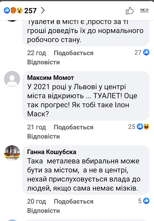Один із дописувачів – Максим Мамот на нашій сторінці у Фейсбуці написав: «У 2021 році у центрі міста відкриють...туалет! Оце так прогрес! Як тобі таке, Ілон Маск?».