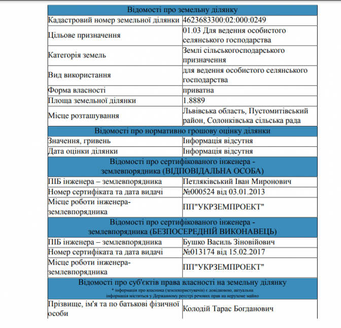 Відповідно до даних Державного земельного кадастру, Тарас Колодій став власником 13 квітня. До цього чиновники Держгеокадастру передали її у приватну власність. Призначення земельної ділянки – для ведення особистого селянського господарства.