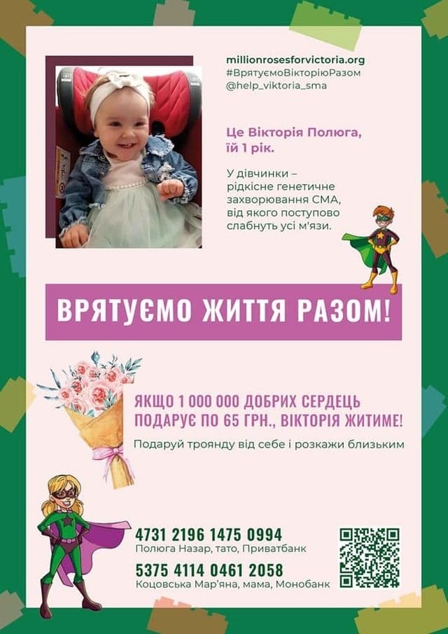 Вікторії Полюзі 1 рік. 2 місяці тому в неї діагностували СМА (спінальну м’язову атрофію), від якої поступово слабнуть всі м’язи, втрачається здатність сидіти, тримати голову, а з часом і самостійно дихати. Часу на порятунок обмаль, але смертельне захворювання може повністю вилікувати ін’єкція препарату Золгенсма.
