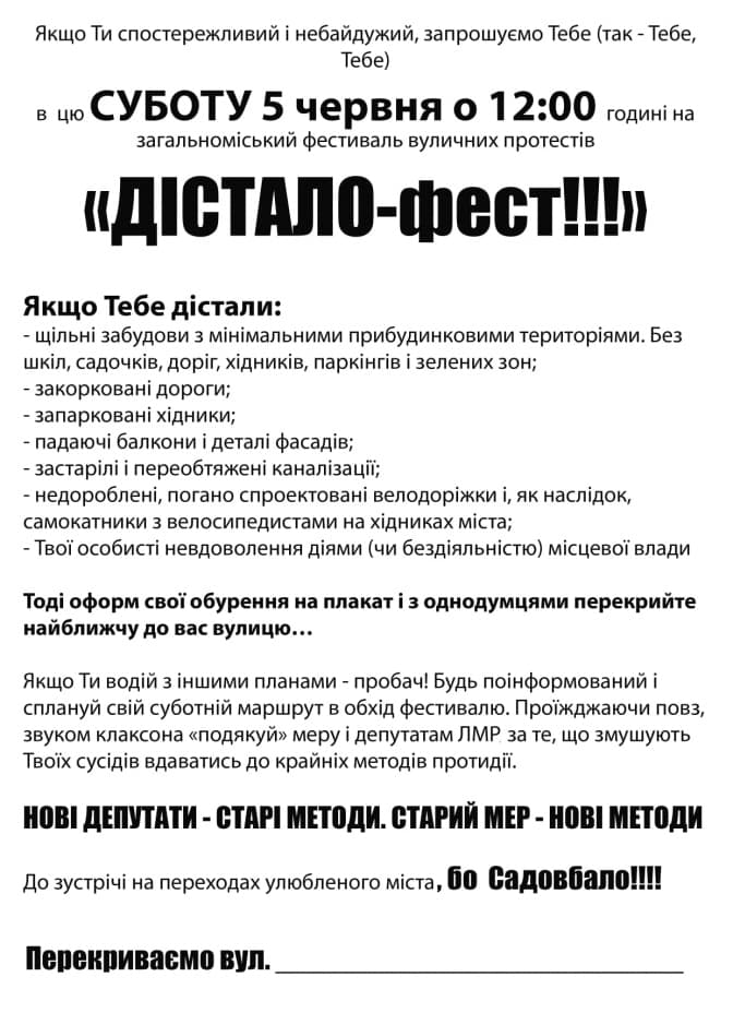 «Рік тому Садовий приїжджав на район, обіцяв виправити помилки, створити за місяць новий детальний план територій. Головний архітектор обіцяв повернути у власність громади усі необхідні ділянки озеленення та соціальної інфраструктури, проте наразі далі обіцянок справа не пішла», – зазначила мешканка Олена Шумська.