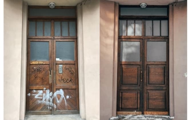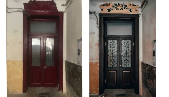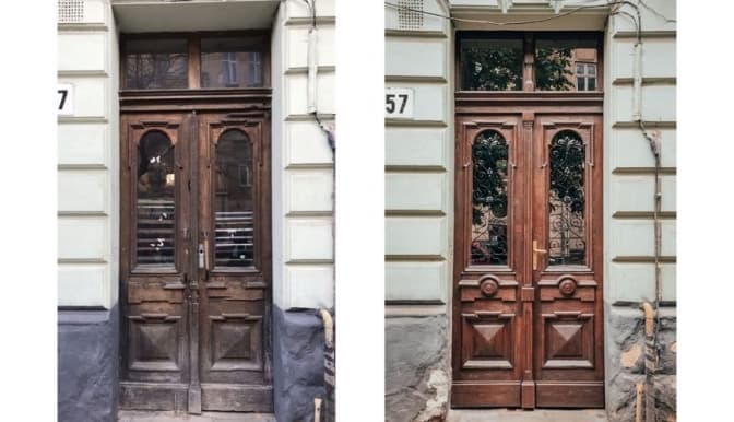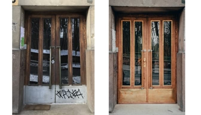 У центрі Львова, на вул. Академіка Павлова, 9 реставратори відновили дерев’яні історичні соснові двері, які відчиняють у дві сторони. Тут провели заміну скла, яке було там не рідним і різне, а ще нанесли на нього малюнок із рослинним орнаментом. Крім того, фахівці відремонтували пошкоджені завіси та підібрали ручку відповідно до стилістики та часу побудови будинку.