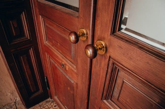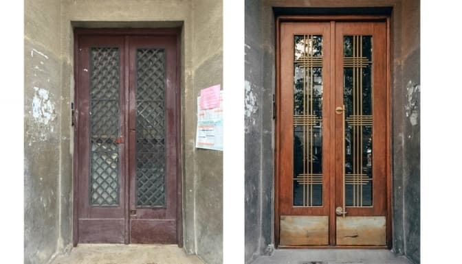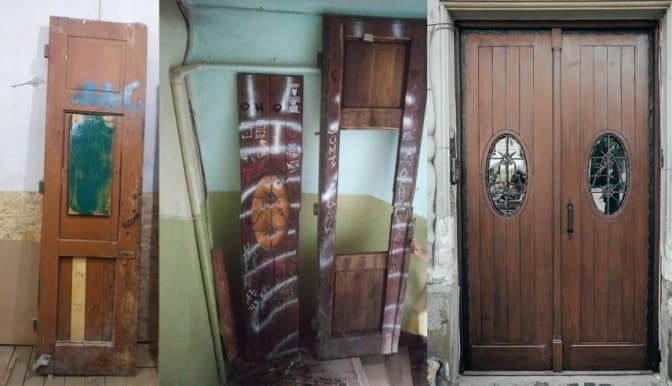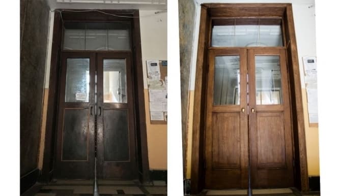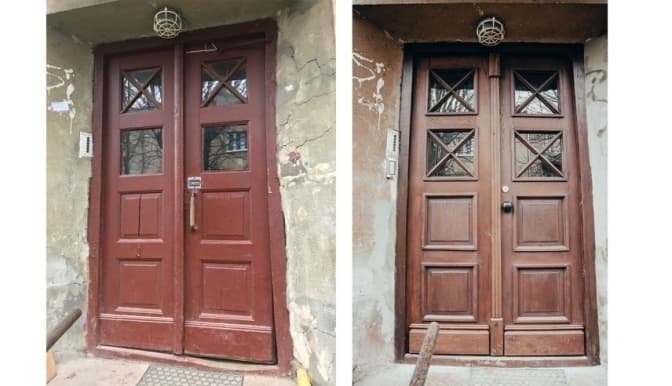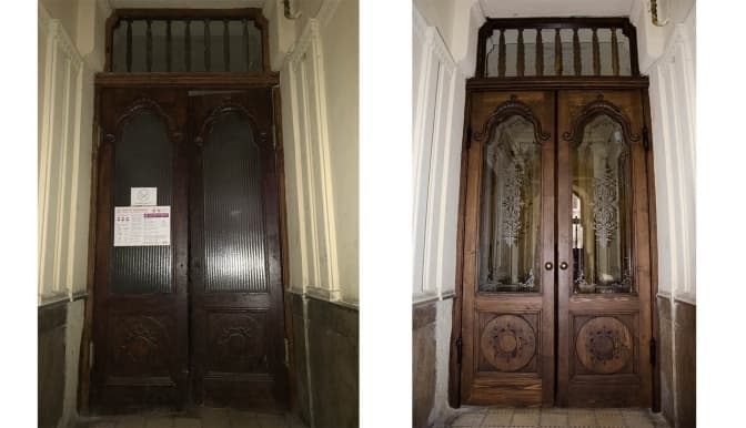Ці двері зроблені із сосни, як і більша частина внутрішніх дверей у львівських будинках. Раніше мешканці фарбували двері, тому на них утворилося багато шарів фарби. Реставратори відчистили шари фарби, відновили старе скло і втрачені ручки.