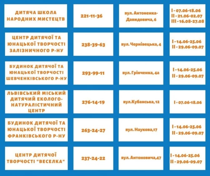 Табори цього року проводитимуть при Ліцеї №21, Львівській школі №71, НВК «ШЕЛ». Табори триватимуть приблизно 10 днів та відбуватимуться у режимі прогулянкових груп.