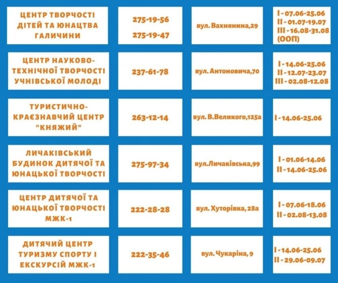 Крім цього, усі львівські діти можуть безкоштовно відвідувати табори при закладах позашкільної освіти, які також діють у режимі прогулянкових груп. Кожен заклад має свій план роботи. Табори діятимуть у всіх районах Львова на безкоштовній основі.