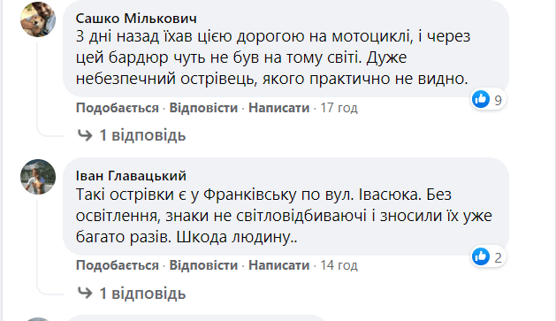 «На цій ділянці були наїзди на пішоходів. Там не раз траплялись ДТП. Один водій пропускає пішохода, інший, що рухається іншою смугою, – ні. Але не можуть бути встановлені острівці безпеки так, як цей. Нам кажуть, що знак збили», – розповів він.