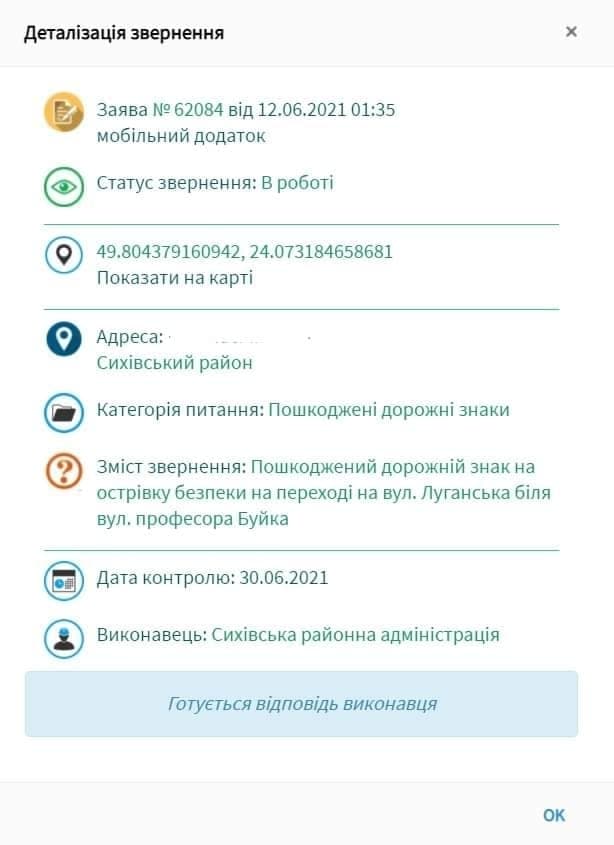 Як з'ясувалось, мешканці міста звертались на «Гарячу лінію міста» із повідомленнями про небезпеку на цій ділянці на вулиці Луганській. Писали про те, що немає дорожніх знаків на острівці безпеки. Зокрема, «Зручне місто» опублікувало на своїй сторінці у Фейсбуку скріншоти цих звернень. Вони датовані 12.06 та 15.06. 2021.