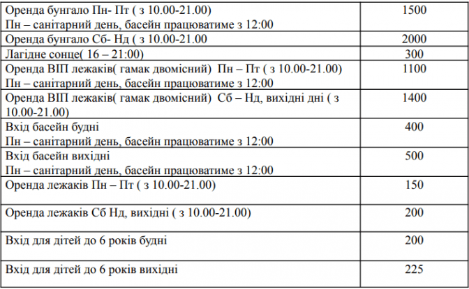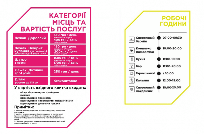 Для дорослих година коштуватиме 120 грн, дві – 200 грн, а повний день – 300 грн. Для дітей до 14 років година обійдеться у 70 грн, дві – 110 грн, а повний день – 180 грн.