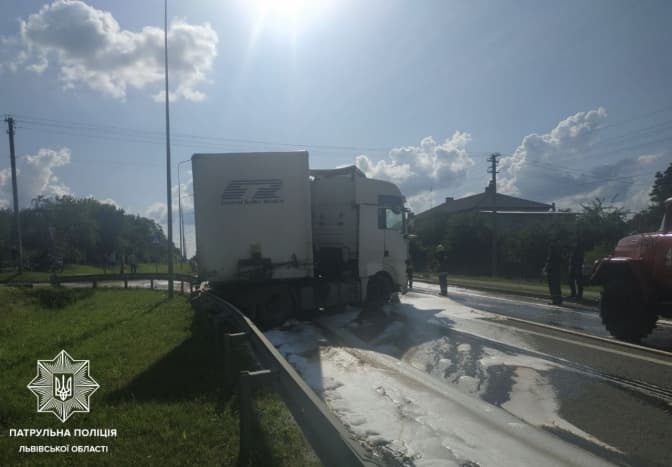 На місці події працюють патрульні та ДСНС, які усувають наслідки розливу. Рух транспорту перекритий.