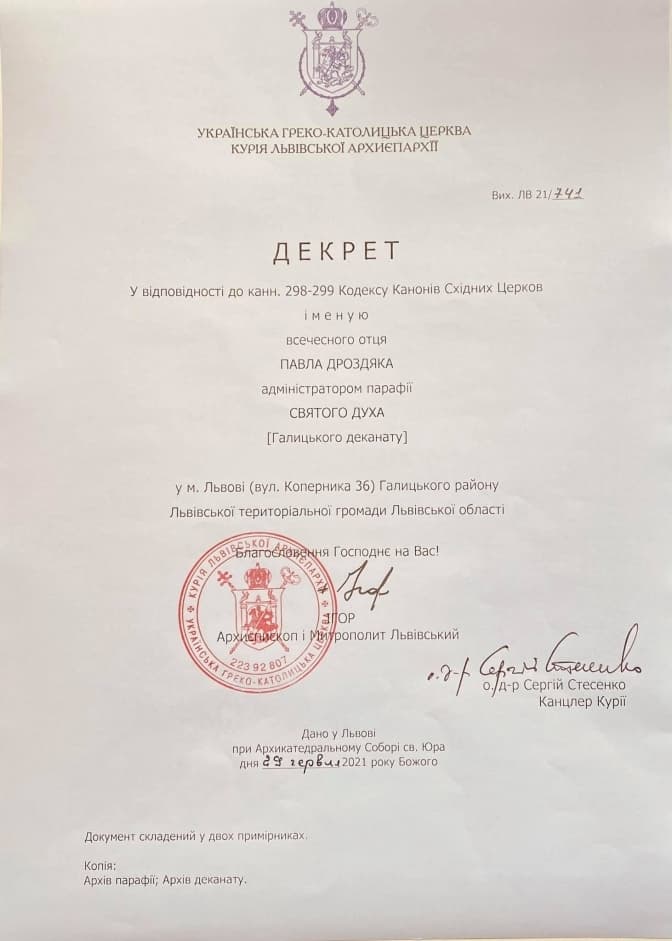 Церква Святого Духа, що на вул. Коперніка, 36, відтепер матиме свого керівника. Сьогодні, 13 липня, декретом Митрополита Львівського Ігоря, адміністратором парафії призначили отця Павла Дроздяка. Про це Тvoemisto.tv розповів капелан Львівської міської ради, сотрудник Собору Святого Юра, а тепер ще й адміністратор Святодухівської церкви отець Павло Дроздяк.