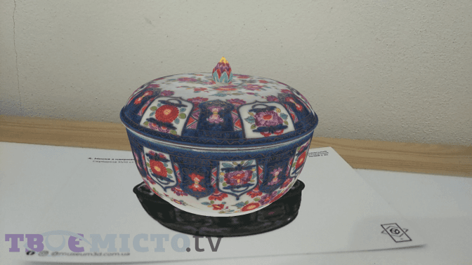 Фарфорова миска з накривкою, уквітчана візерунками півоній і хризантем, імітує японський посуд у стилі імарі. Технологія виготовлення порцеляни до ХVIII ст у Європі не була поширена, тож посуд завозили з Китаю. Коли німецьким майстрам вдалося виготовити цю миску, вони прикрасили її звичними японськими візерунками.