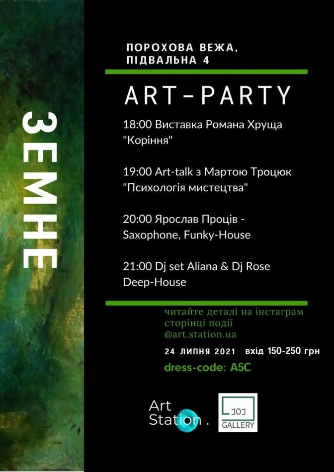 Це буде мистецька подія «Земне», де кожен відвідувач зможе подивитися на виставку картин, відвідати лекцію про мистецтво, послухати живу музику, а також зануритись у світ творчих вібрацій і знайти своє відображення в цьому світі.