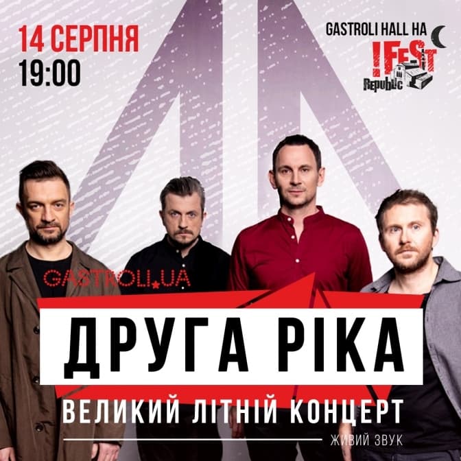 14 серпня у Львові виступить відомий український рок-гурт «Друга Ріка». За плечима виконавців 25 років музичної роботи, 7 студійних альбомів, сотні відіграних концертів. Гурт став одним з найуспішніших проєктів вітчизняної сцени. Львів’яни мають шанс почути наживо відомі та багатьма улюблені треки «Так мало тут тебе», «П'ю з твоїх долонь», «Три хвилини», «Відчиняй», «Секрет», «Незнайомка» та інші.