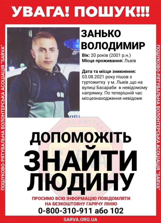 У Львові розшукують 20-річного хлопця Володимира Занька. Три дні тому він пішов із гуртожитка, що на вул. Басараби в невідомому напрямку. Про пошук повідомили у пошуково-рятувальній волонтерській організації «Сарва».