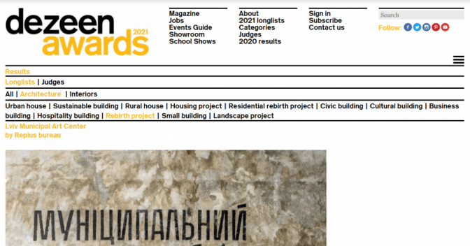 Архітектурний проєкт Львівського муніципального мистецького центру потрапив до переліку премії Dezeen Awards 2021 в категорії Rebirth proect. Авторкою архітектурного проєкту центру була Христя Бадзян, співзасновниця архітектурного бюро Replus.