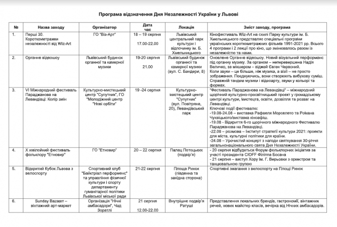 24 серпня Україна відзначає 30-річчя своєї незалежності. Із нагоди свята у Львові відбуватиметься безліч заходів. Так, святкування буде складатися з двох частин – офіційні заходи та мистецькі. Цього року планують охопити кожен район міста і населені пункти Львівської міської територіальної громади.