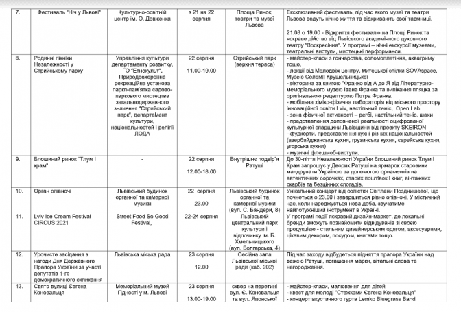 Однією з найбільш масових подій до Дня Незалежності стане фестиваль «Ніч у Львові». Минулого року захід не проводився через карантинні обмеження, але цьогоріч організатори відновлюють традицію. «Ніч у Львові» проводиться для промоції і популяризації музейних установ міста, щоб кількість їх відвідувачів постійно зростала. Центральною темою цьогорічного фестивалю буде власне незалежність нашої держави. Організатори обіцяють насичену програму, живі емоції та неочікувані локації, які нікого не залишить байдужим.
