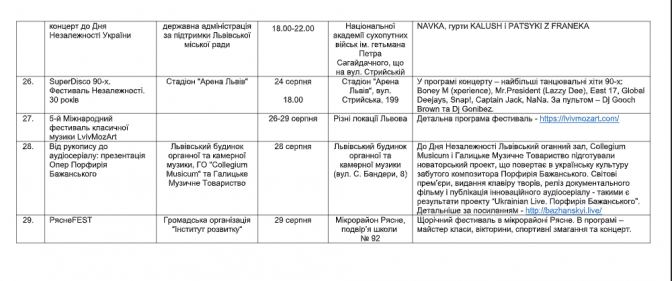 На площі біля Національної академії сухопутних військ ім. Сагайдачного. відбудеться великий святковий концерт, під час якого на львів’ян за гостей міста очікують виступи таких виконавців, як Аркадій Войтюк, ALYONA ALYONA, NAVKA, гуртів KALUSH і PATSYKI Z FRANEKA.