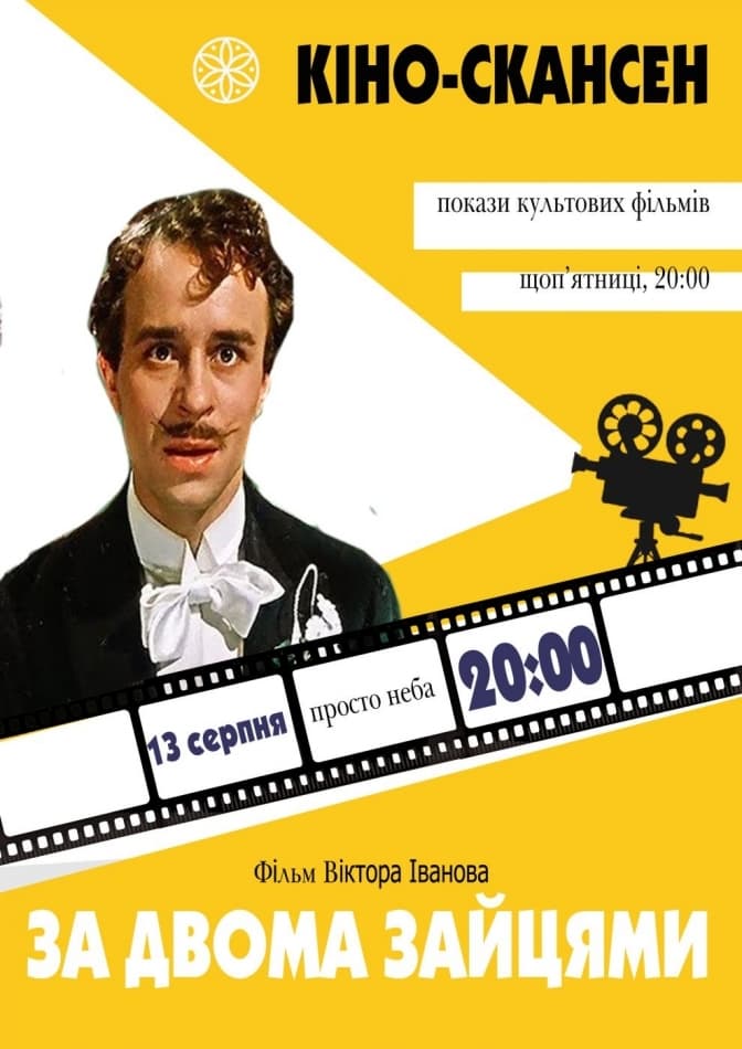 Сьогодні, 13 серпня, у Музеї народної архітектури і побуту ім. К. Шептицького запрошують усіх бажаючих відвідати кінопоказ відомої комедії «За двома зайцями», йдеться на сторінці Музею.