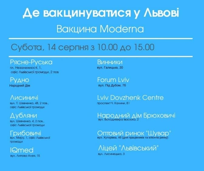 Сьогодні, 14 серпня, з 10.00 до 15.00 год. вакцинуватимуть вакциною Moderna у: