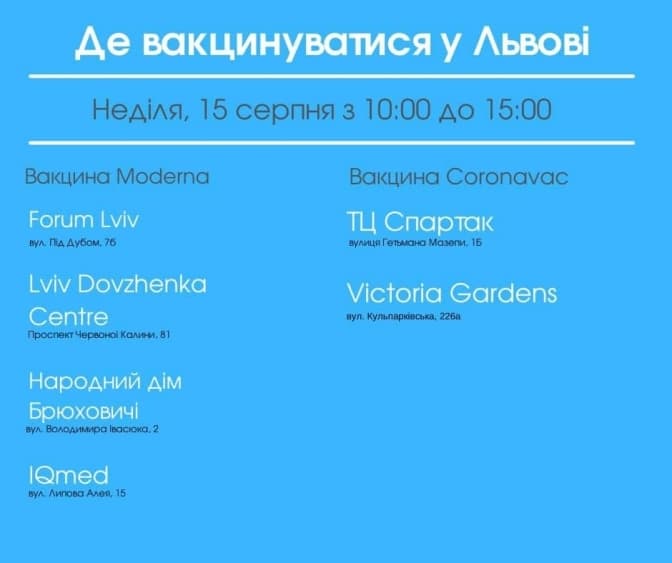 Також у неділю, 15 серпня, з 10.00 до 15.00 год. вакциною CoronaVac щепитимуть у: