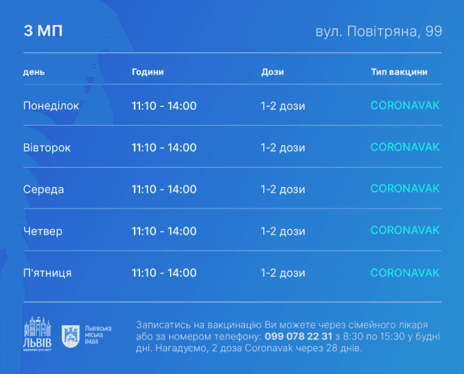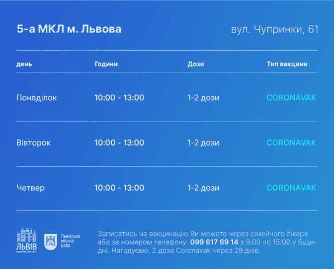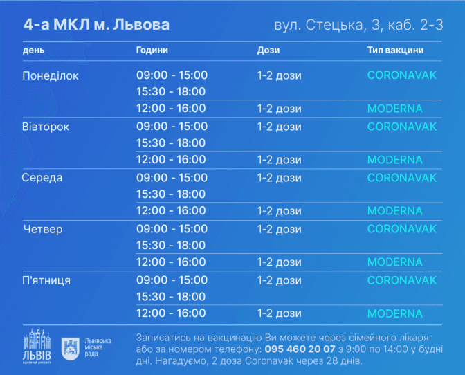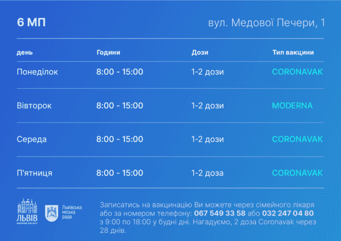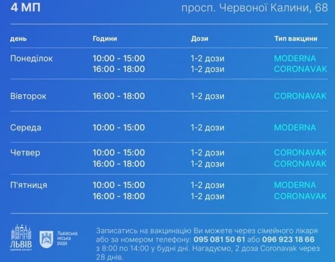 Що стосується центрів масової вакцинації, то їхній графік на цей тиждень такий: