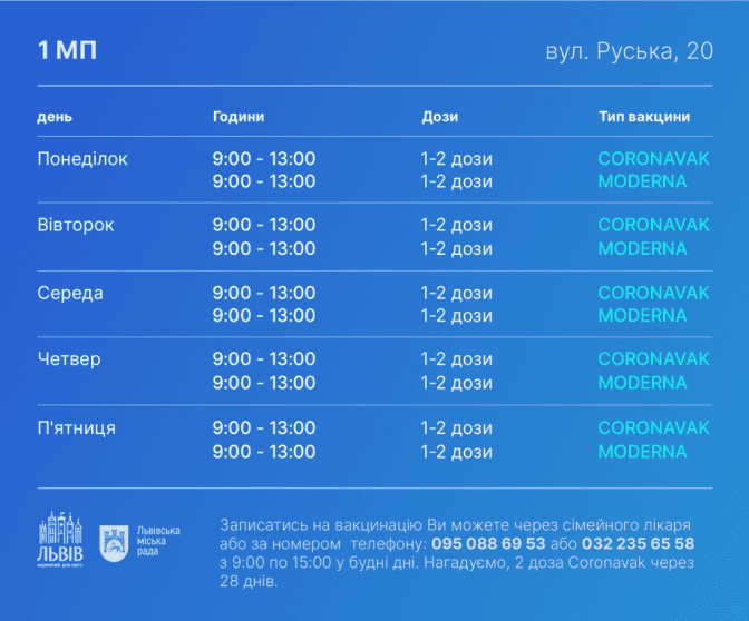 В усіх трьох центрах у понеділок буде доступна вакцина Moderna, а з вівторка по п’ятницю – Pfizer.