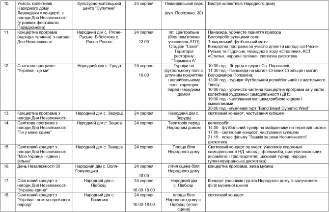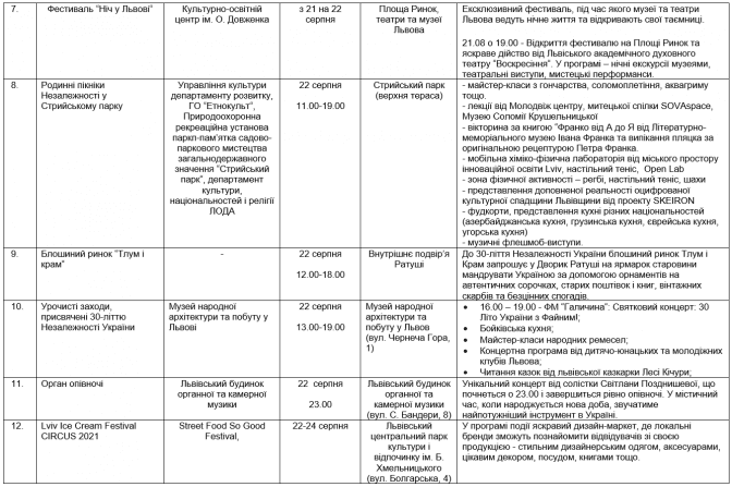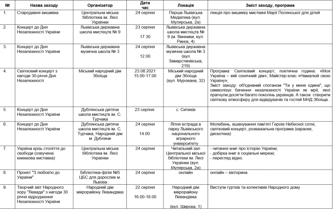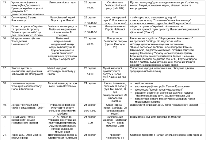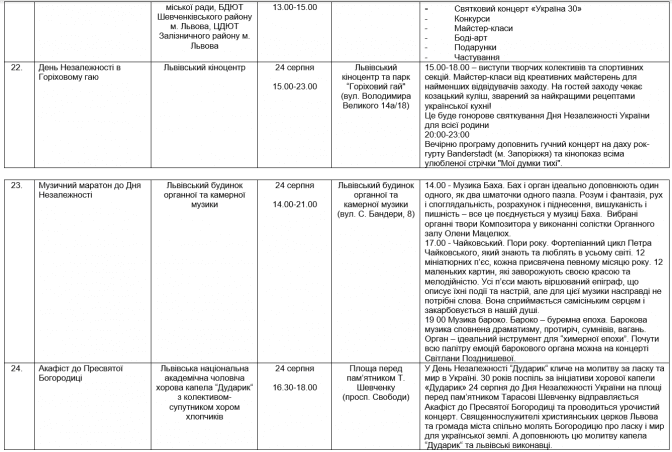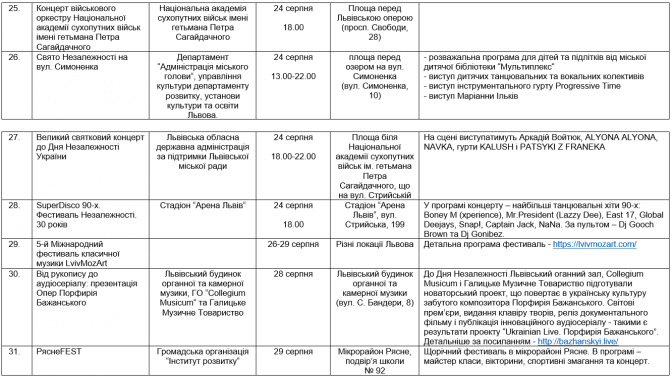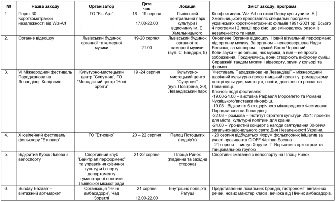 На різних локаціях – у центральній частині міста, а також у Парку культури і відпочинку ім. Б. Хмельницького, будинку органної та камерної музики, Левандівському, Стрийському та парку Горіховий гай, у Палаці Потоцьких, Музеї народної архітектури та побуту – проведуть концерти, розважальні дійства.
