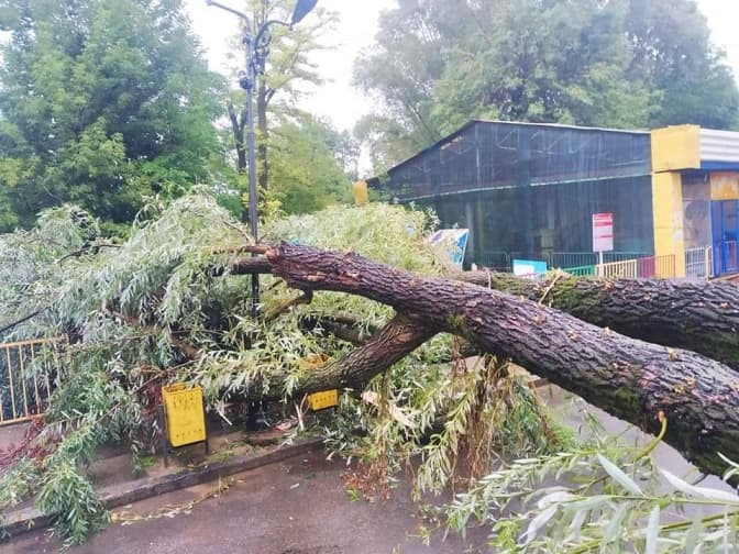 «На алею і на атракціон «летюча машина» впав великий ясен. У ньому, ймовірно, було пошкоджене коріння. Крім того, зламана яблуня, туї, каштан і частина ясена на верхній алеї», – каже вона.