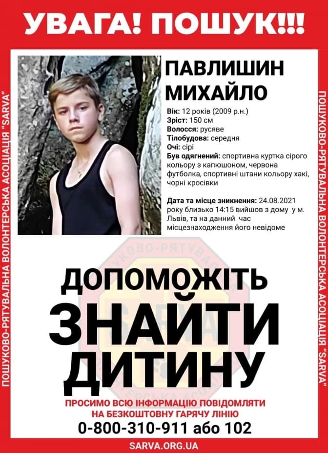 Михайло Павлишин вчора, 24 серпня, близько 14.15 год. вийшов з дому та на даний час місцезнаходження його невідоме. Матір хлопця звернулася у поліцію і сказала, що телефонного зв’язку зі сином немає.