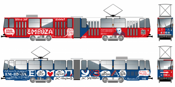 Трамвай із особливою лівреєю курсує за маршрутом №2. Він їздитиме містом впродовж серпня-вересня. Окрім зображення поета Ярослава Сайферта та його віршів, на трамваї розмістили QR-код. Відсканувавши його, можна дізнатися більше про чеського Нобелівського лауреата, ознайомитись з його поезію.