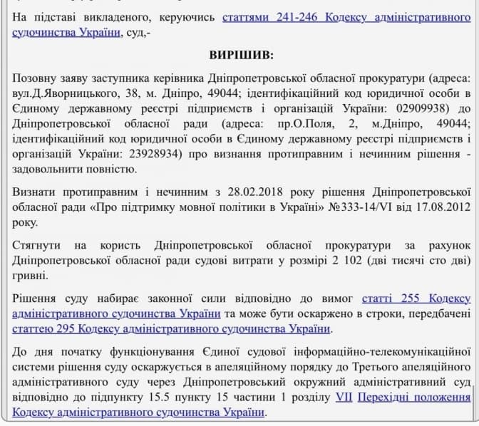 «Нова перемога, яка заряджає! Статус регіональної мови у Дніпропетровській області – скасовано! Майже три роки я звертався спершу до дніпропетровської ОДА, а згодом до прокуратури щодо необхідності скасування регіональної мови. В своїй останній відповіді прокуратура надала мені підтвердження скерування позову в суд», – каже активіст.