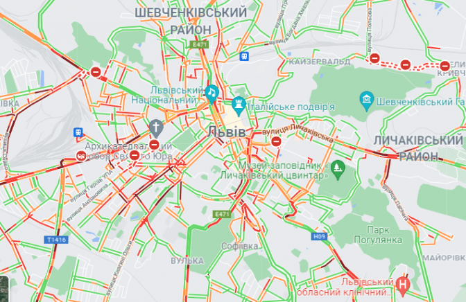 Згідно з мапою Google Maps радять оминати вулиці Замарстинівську, Городоцьку, Личаківську, проспекті Чорновола, Коперника, Івана Франка, Героїв Майдану, Левандівську, Винниченка, Кубійовича, Зелену, Генерала Чупринки. Значні затори сформувалися у Львові також на вулиці Шевченка, Академіка Сахарова та місцями на Стрийській.