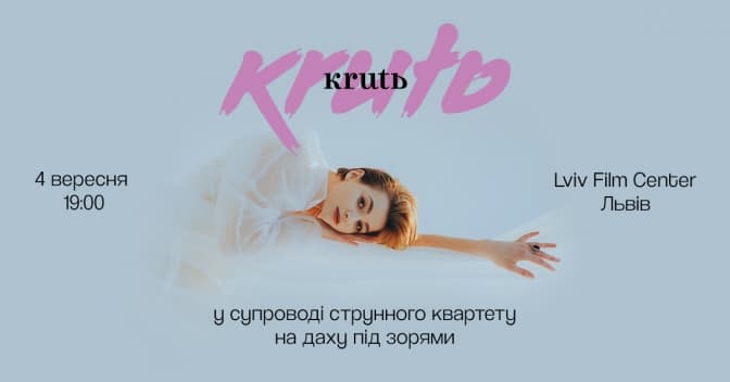 Співачка та бандуристка Марина Круть (KRUTЬ) 4 вересня виступить у супроводі струнного квартету у Львові на даху Lviv Film Center. Кожна композиція – будь це пісня з Нацвідбору Євробачення «99», чи стверджувальна «Ок», чи філософська «Кімната» – отримає нове життя від звуків живих струнних у поєднанні з вишуканим та пронизливим голосом Марини Круть.