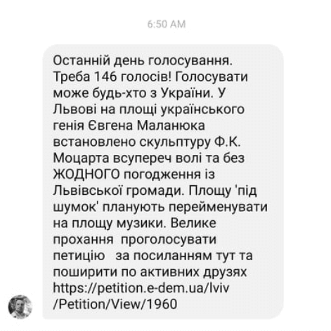 У Львові за допомогою розсилки у Facebook закликають підтримати петицію про демонтаж пам’ятника сину Моцарта. У повідомленнях також йдеться про те, що площі хочуть дати назву «площа Музики».