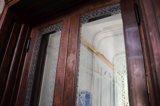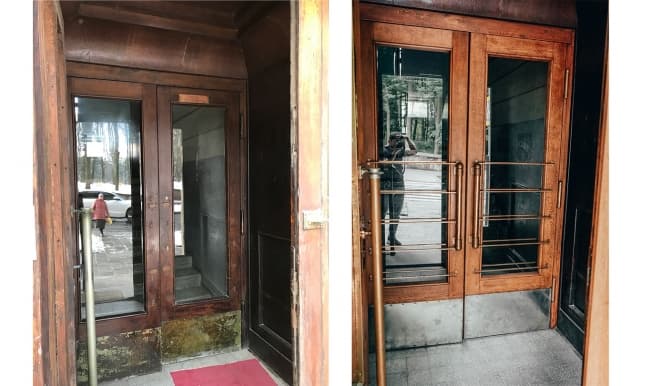 Раніше вони були доволі знищені: стерта фарба, зношений вигляд та втрачені ручки. Фахівцям вдалося відновити їхній первісний вигляд, а також автентичний колір та вишукані оздоблення. На цих дверях були вибиті завіси, ми їх відремонтували, а також укріпили коробку, яка була зрушена, особливо з правого боку. Також замінили третину порогу з внутрішньої сторони, виготовили внутрішні арочні стулки та прикріпили їх на завіси, щоб можна було вставляти скло.